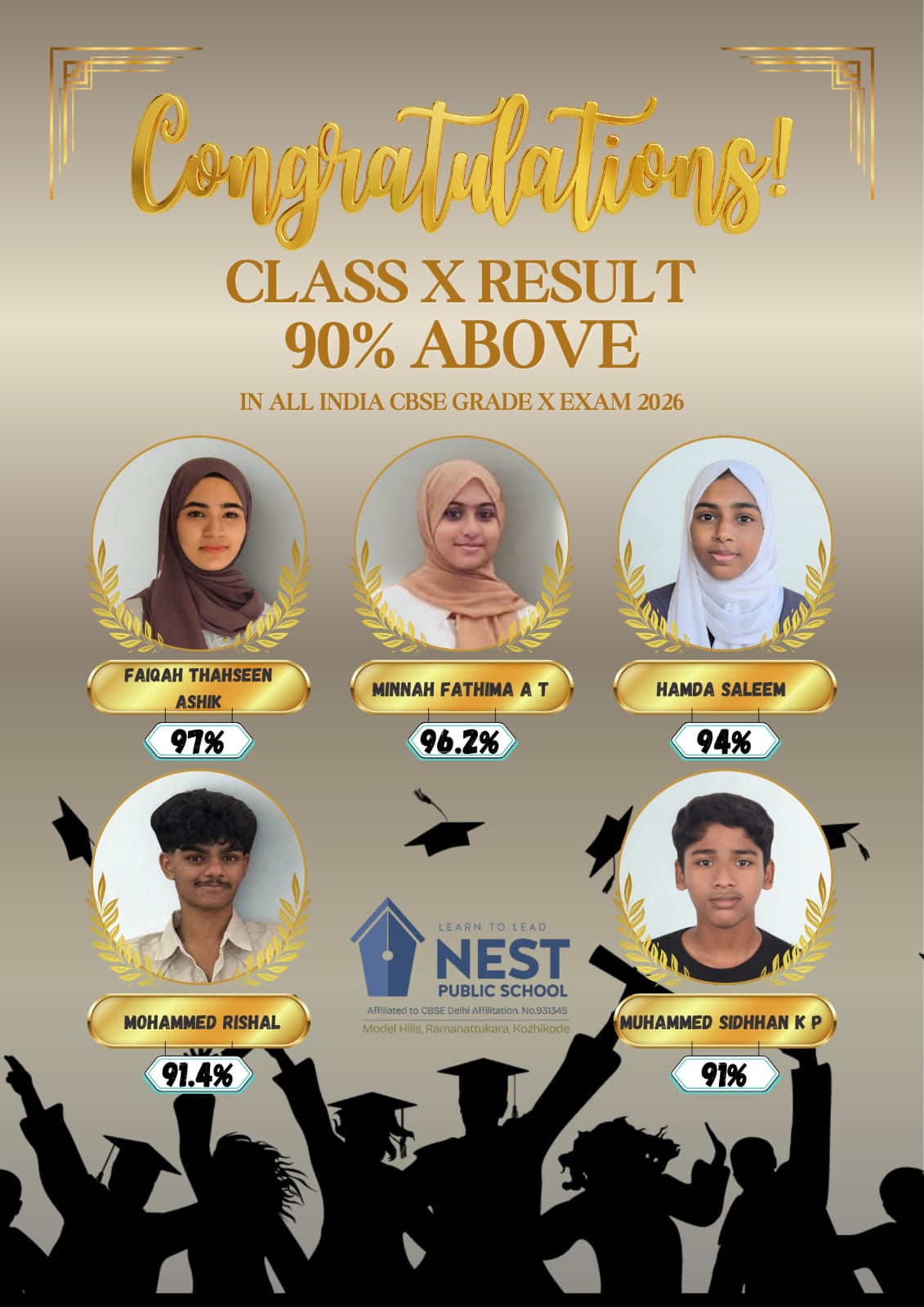 A proud moment of excellence and achievement, this poster celebrates the outstanding success of students in the Class X CBSE Examination 2026. With a grand golden “Congratulations” heading, it honors the dedication, perseverance, and brilliance of high achievers who scored above 90%. Each student is beautifully showcased with their portrait, name, and remarkable score, symbolizing hard work turned into success. The elegant gold accents and laurel designs reflect victory and honor, while the joyful silhouettes at the bottom capture the spirit of celebration and new beginnings. At the heart of it all stands NEST Public School, representing guidance, learning, and leadership—shaping bright futures and inspiring excellence. This is not just a result announcement, but a tribute to determination, dreams, and the journey toward success.